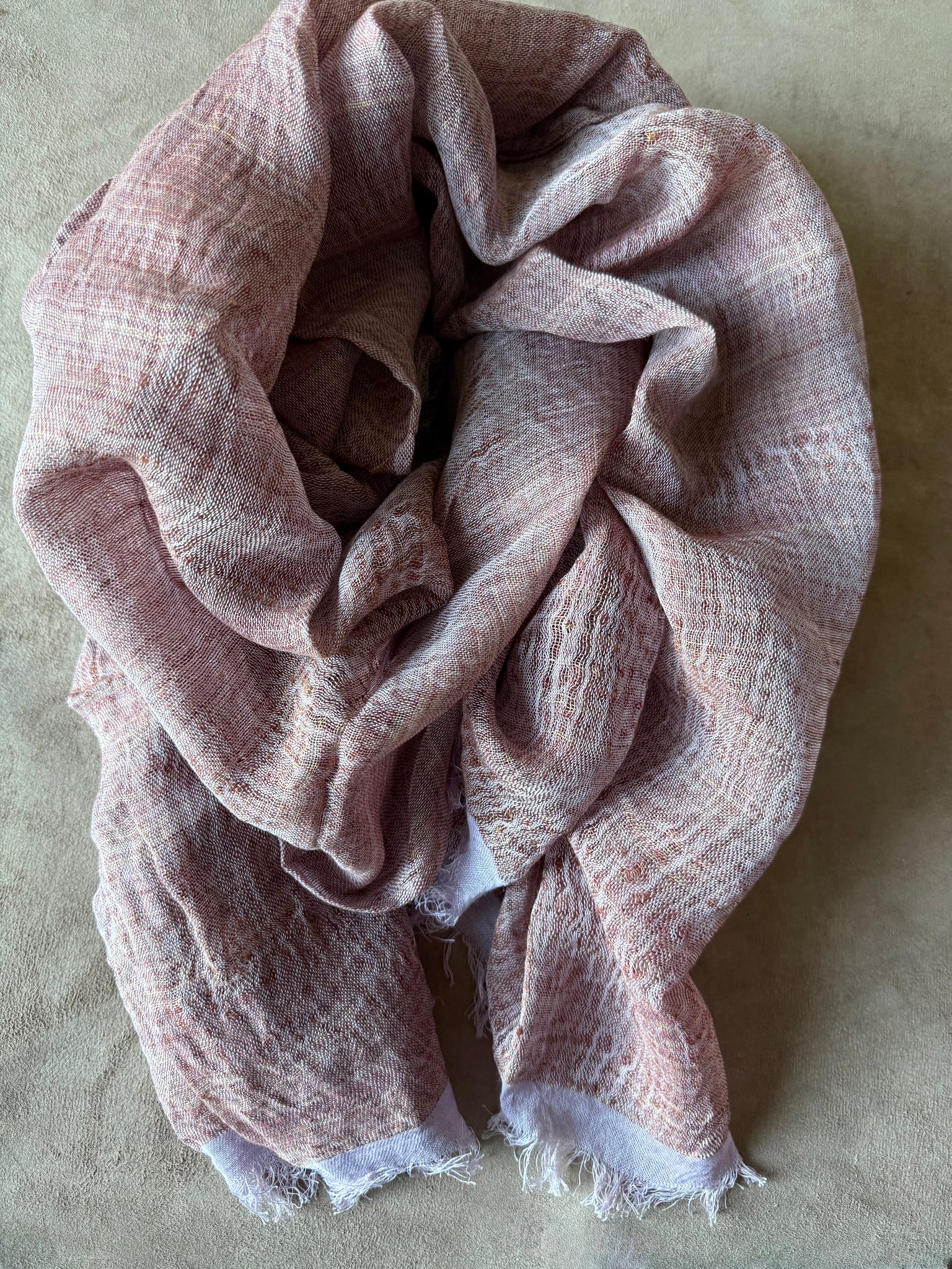 Sourced directly from the weaver in a small workshop hidden in the Marrakech souks. Amethyst on the warp, copper on the weft. Hand wash in cold water. 29" X 74"