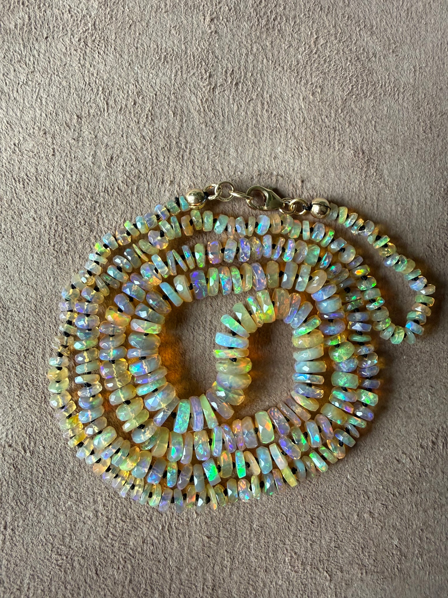Graduated opals hand knotted with black thread and gold fill lobster claw clasp. Shocks of color with neon blue, green and peach. 24 inches long.