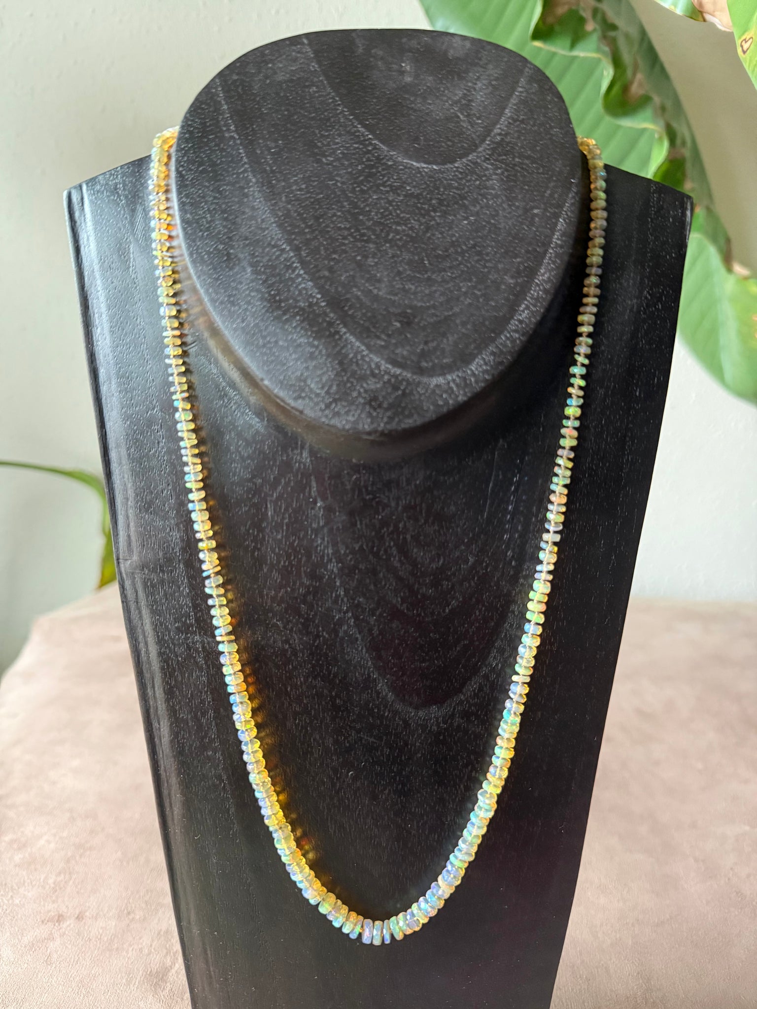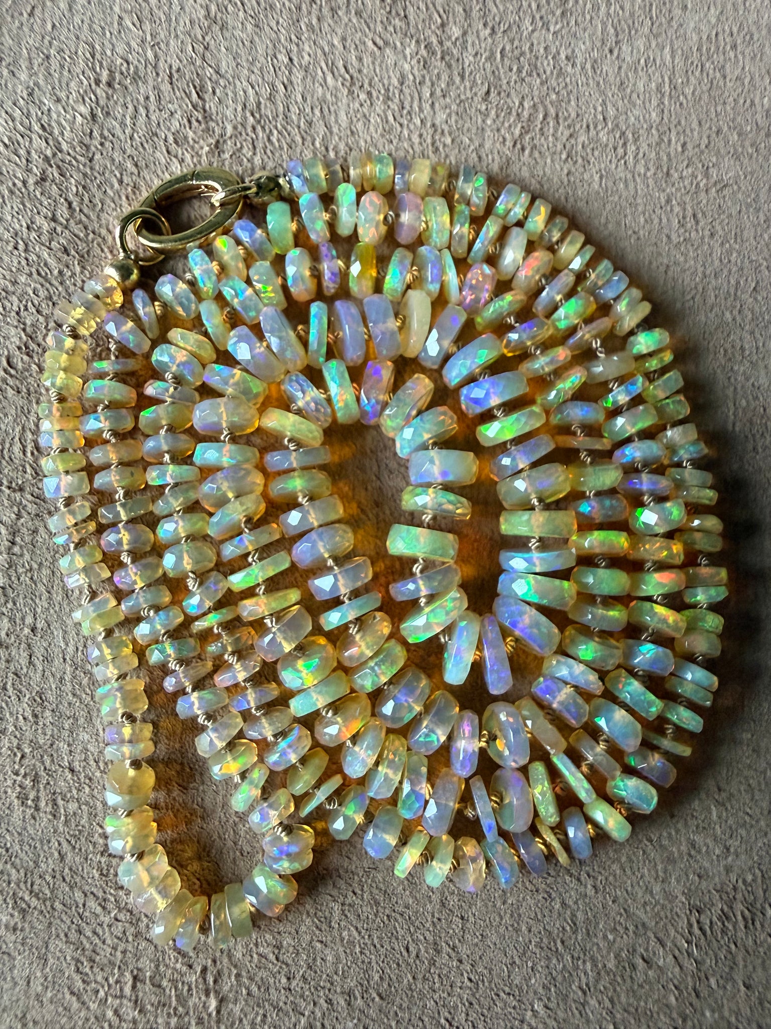 Graduated opals hand knotted with black thread and gold plated oval clasp (push in to release). Shocks of color with neon blue, green and peach. 25-1/4 inches long.